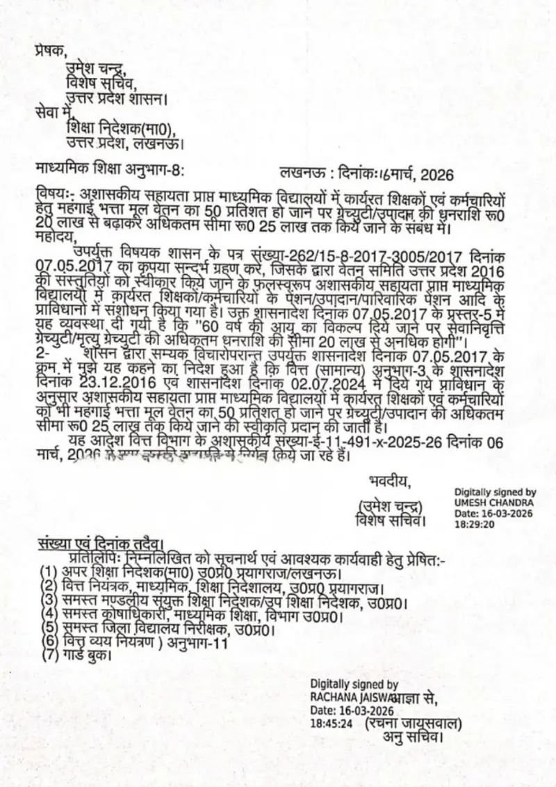 UP Aided Teachers Retirement Benefits: उत्तर प्रदेश राज्य के एडेड माध्यमिक विद्यालयों में काम करने वाले शिक्षकों और कर्मचारियों के लिए एक नया अपडेट सामने आया है। राज्य सरकार ने इन स्कूलों में कार्यरत लोगों को राहत देते हुए ग्रेच्युटी की अधिकतम सीमा बढ़ाने का फैसला किया है। अब तक जहां यह सीमा 20 लाख रुपये तक तय थी, वहीं अब इसे बढ़ाकर 25 लाख रुपये कर दिया गया है। बता दें कि उत्तर प्रदेश एडेड स्कूल Teachers Gratuity Increase का असर प्रदेश के हजारों शिक्षकों और कर्मचारियों पर पड़ेगा, जो लंबे समय से इस बदलाव की मांग कर रहे थे।